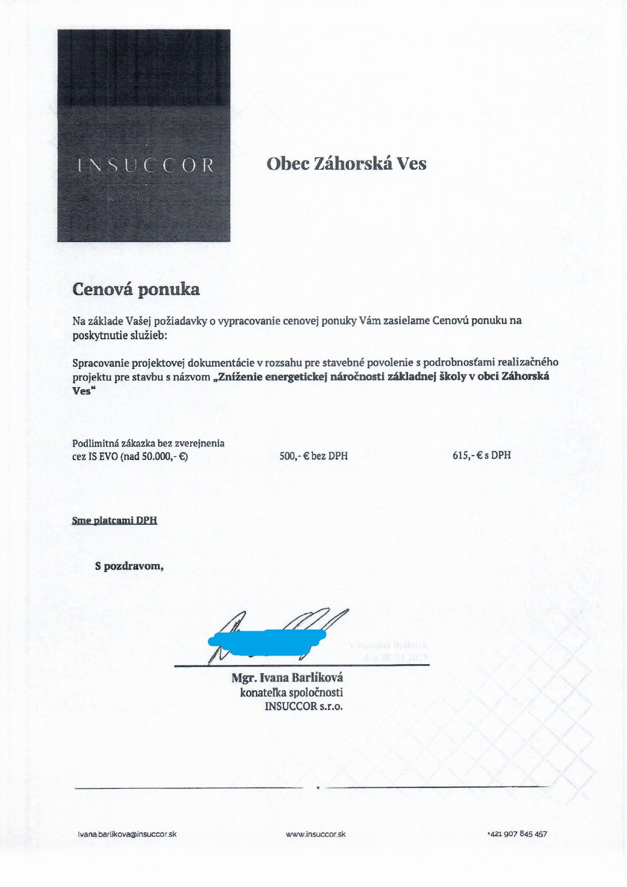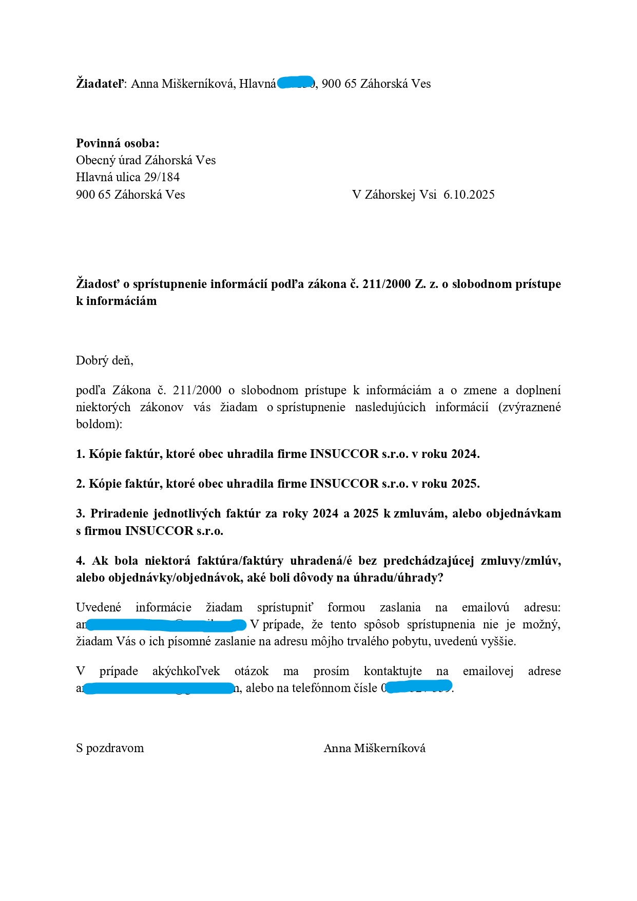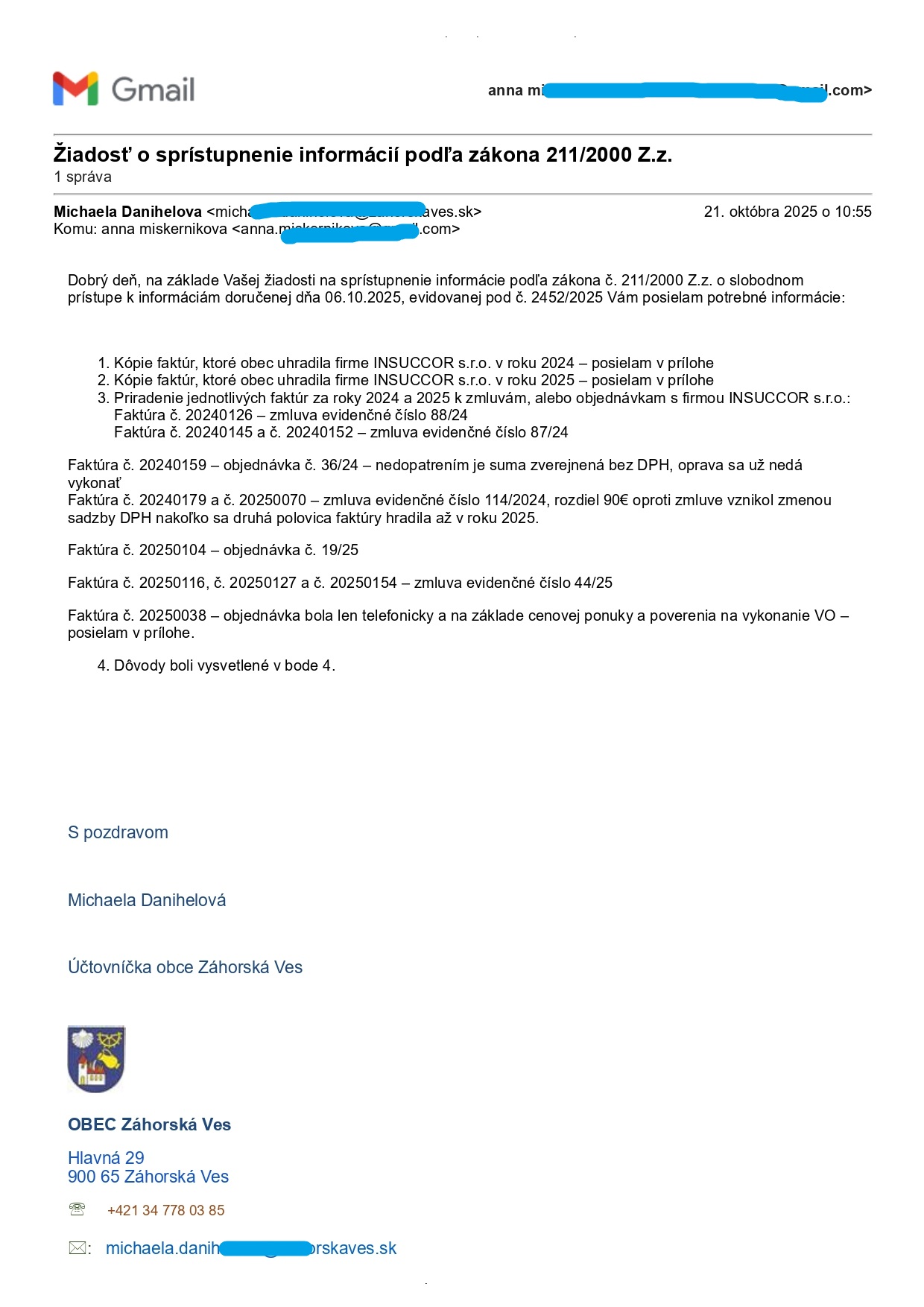 V pondelok 6.10.2025 som poslala na náš obecný úrad žiadosť o poskytnutie informácií ohľadom faktúr od firmy INSUCCOR s.r.o. To je firma, ktorá pre obec spracúva a podáva projekty a žiadosti o poskytnutie dotácií. Inde na takúto prácu majú projektového manažéra, my si na to platíme firmu. Iste, nájsť zamestnanca, ktorý by túto prácu zvládal, nie je práve jednoduché. Ale my sme sa o to ani nepokúsili. Doteraz sme firme zaplatili 24 692,40 €. Máme za to dve neschválené žiadosti o dotácie na multifunkčné ihrisko a na Slniečko, sľúbené peniaze na rekonštrukciu ZŠ a nezačatý projekt OcÚ.