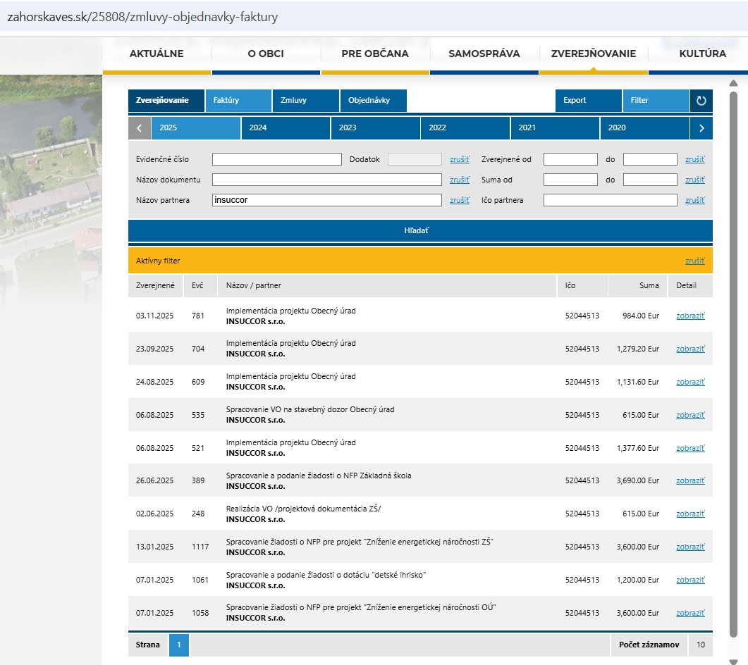 Medzitým sme zaplatili firme INSUCCOR s.r.o. ďalšiu faktúru vo výške 984,00 €. Ak vás zaujalo, že za implementáciu projektu to je už štvrtá faktúra, tak vedzte, že to sú faktúry k zmluve s evidenčným číslom 44/2025.