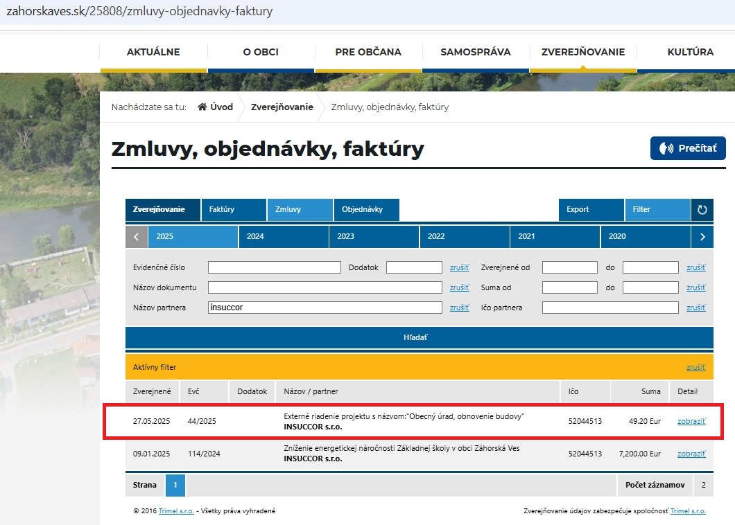 Zmluva s evidenčným číslom 44/2025 je na webstránke obce zverejnená so sumou 49,20 €, čo je však hodinová sadzba za poskytovanie služieb.