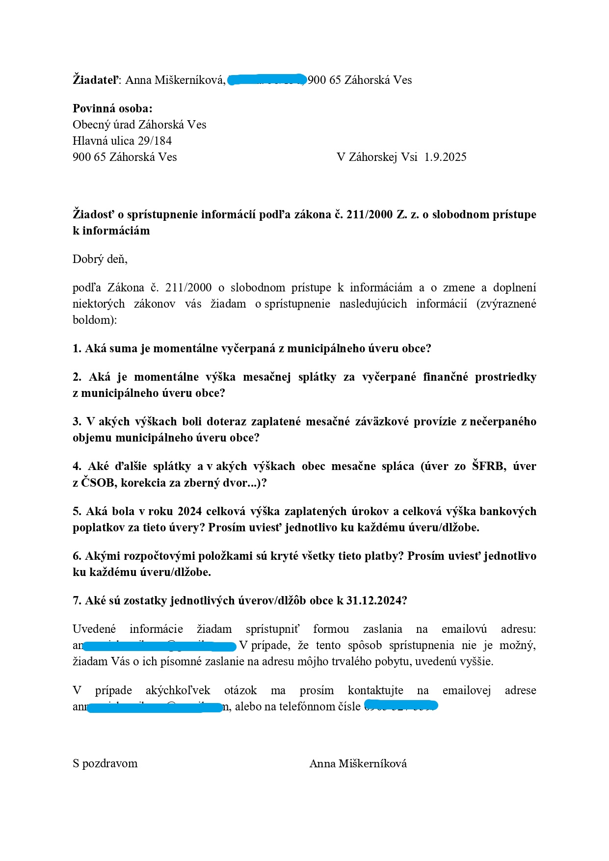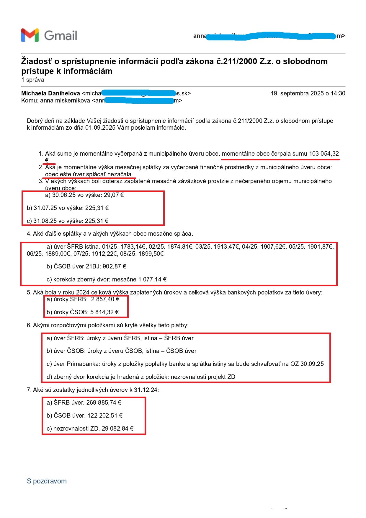 Túto žiadosť o informácie som podala 1.9.2025, vybavená mala byť do 18.9.2025. Odpovede od pani Danihelovej (prišli 19.9.) som zvýraznila červenou, trochu sa totiž v celkovom texte strácajú.