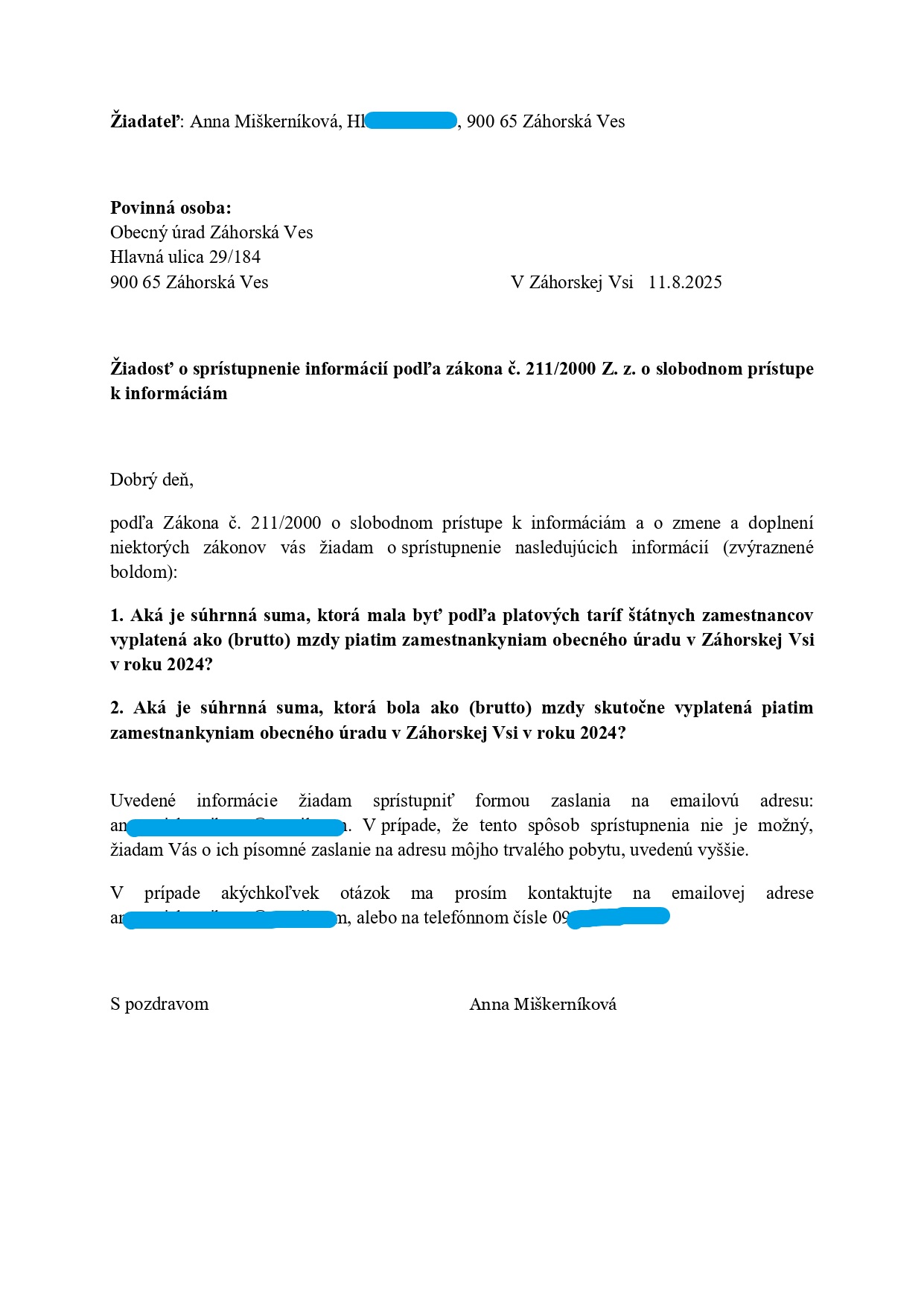 Podotýkam, že prakticky ani jednu z týchto žiadostí by som nemusela posielať, keby obecný úrad riadne zverejňoval všetky dokumenty, ktoré podľa zákona zverejňovať musí (skoro všetko z toho, čo som chcela vedieť, by som si tak mohla sama vyhľadať na webe obce); a tiež keby starosta obce riadne a včas informoval občanov o všetkých podstatných obecných záležitostiach.
