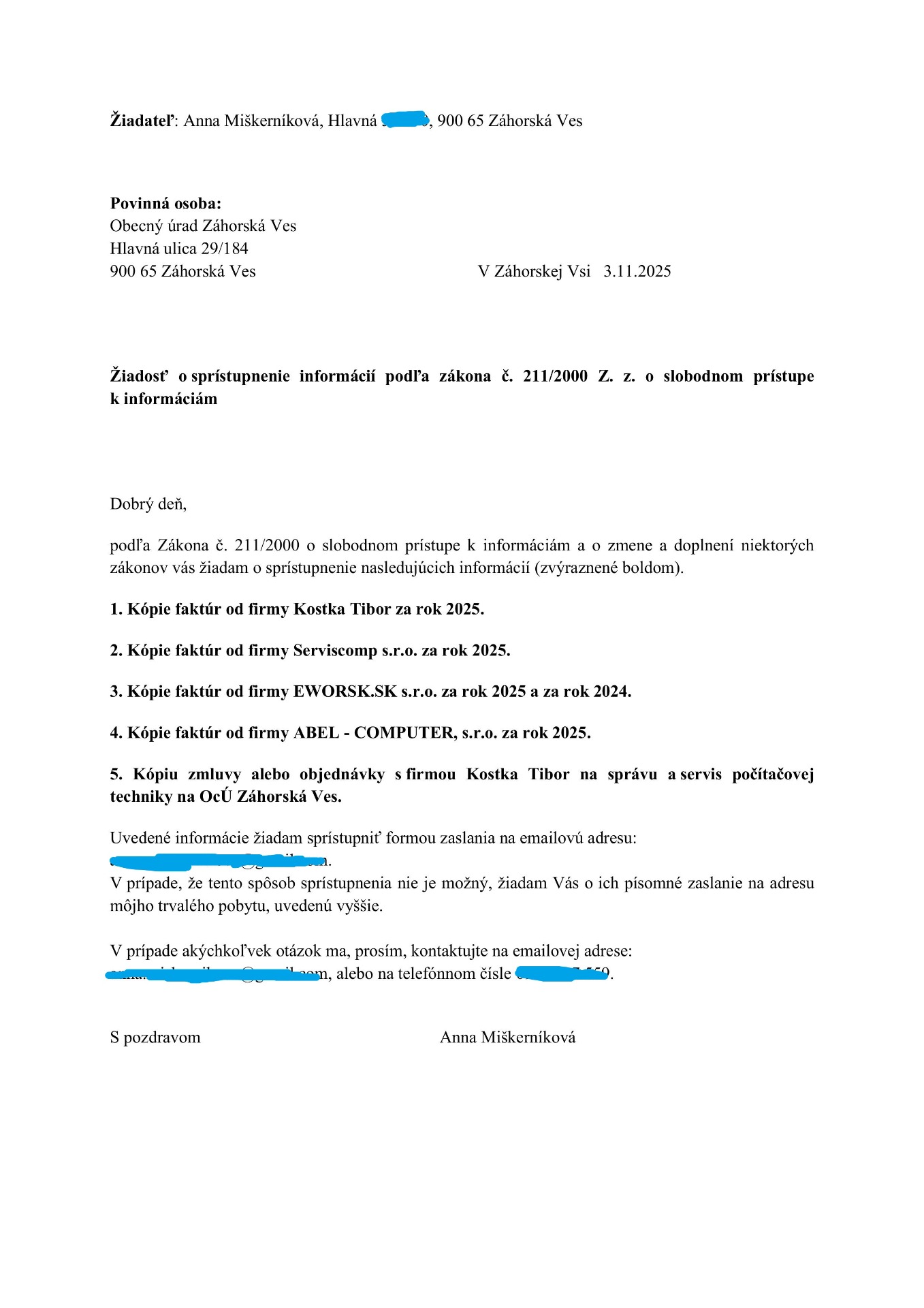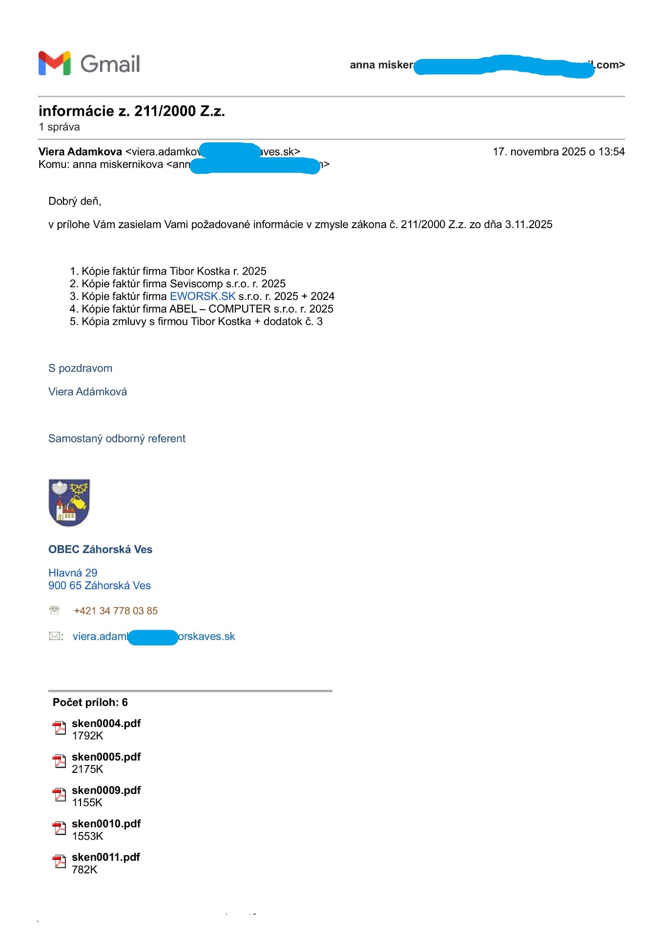 Na výdavky obce za počítačové služby som sa pýtala už v auguste 2023. Pýtala som sa na to mailom, niekoľkokrát, odpovede som však nedostala.