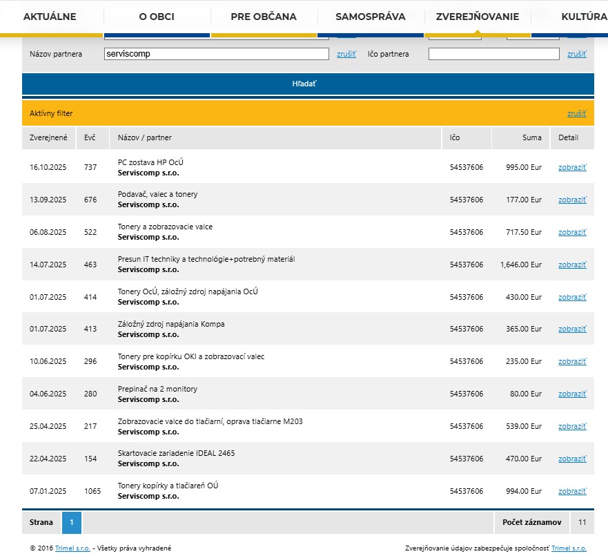 Hoci obec uvádza dvoch IT dodávateľov – živnostníka Tibora Kostku a firmu Serviscomp s.r.o. – v skutočnosti majú rovnakú adresu a firma Serviscomp patrí pánovi Kostkovi. Bez problémov sa to dá overiť v živnostenskom a obchodnom registri.