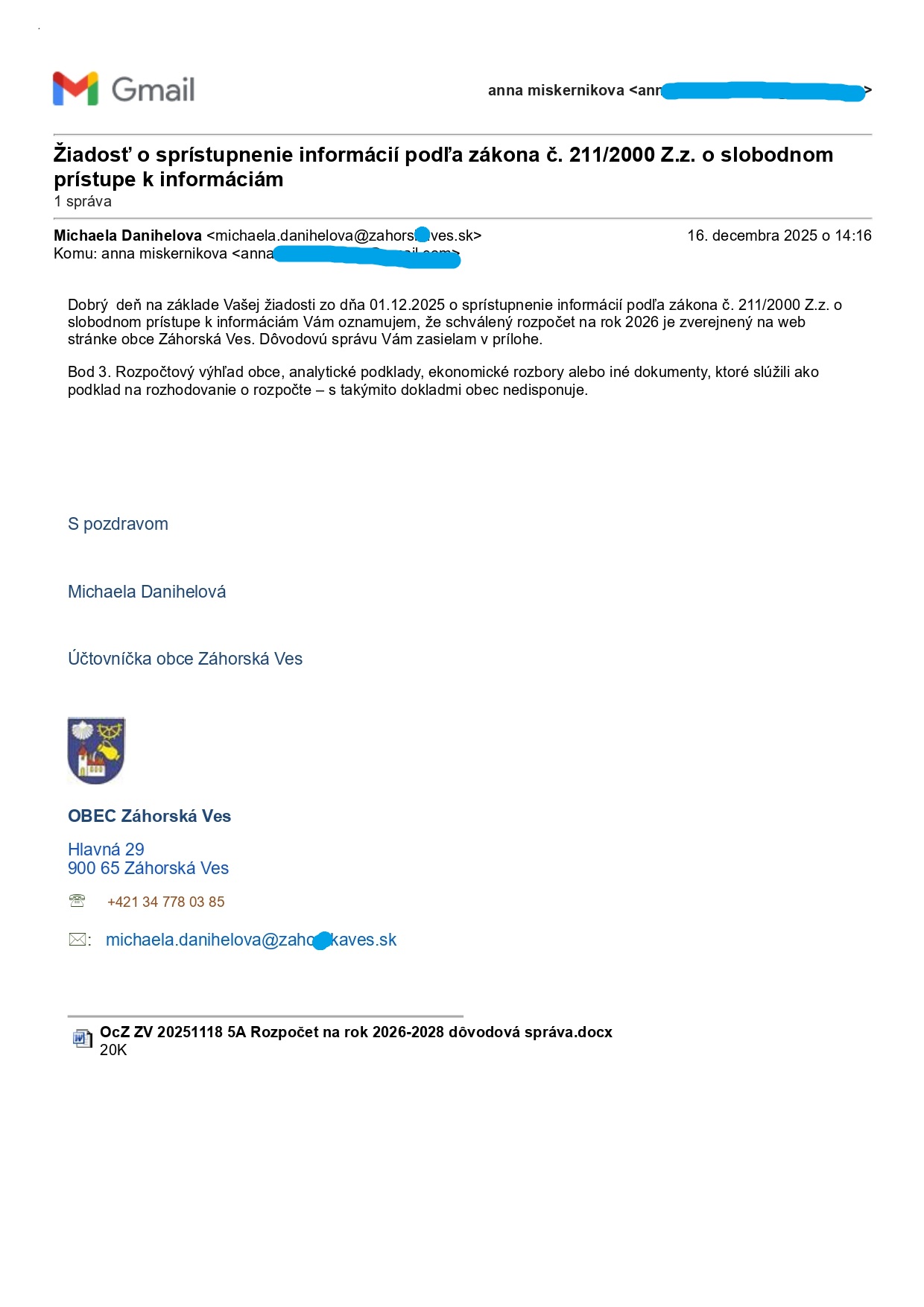 Ďalšiu infožiadosť som si posielala dva týždne po tom, ako poslanci schválili rozpočet obce na rok 2026. Účtovníčka obce ho teda mala hotový, rovnako ako všetky materiály, na základe ktorých rozpočet pripravovala.Stačilo napísať sprievodný list, priložiť k tomu existujúce dokumenty