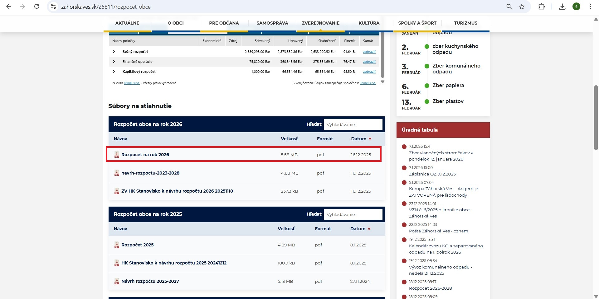 Dátum zverejnenia rozpočtu na webe obce 16.12.2025.