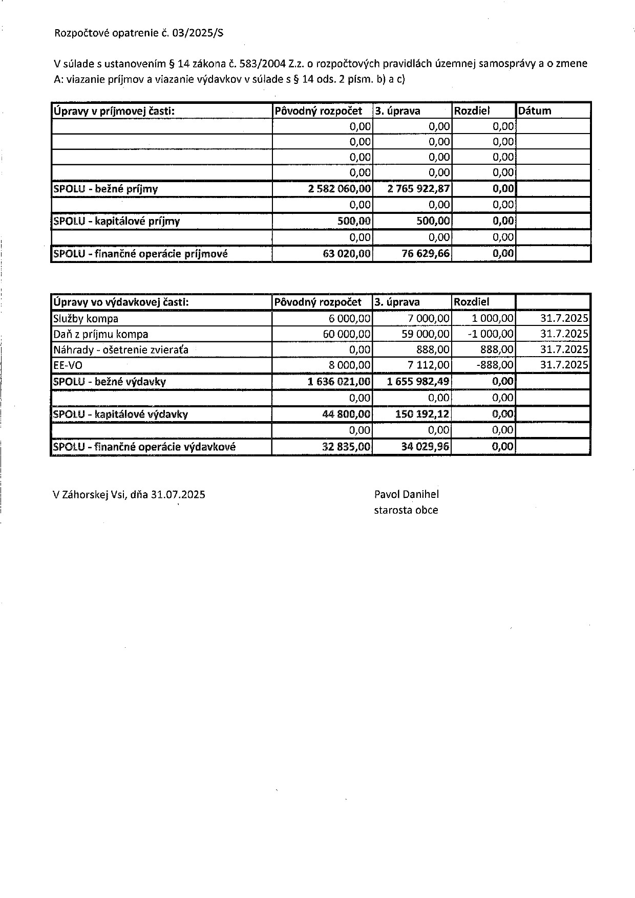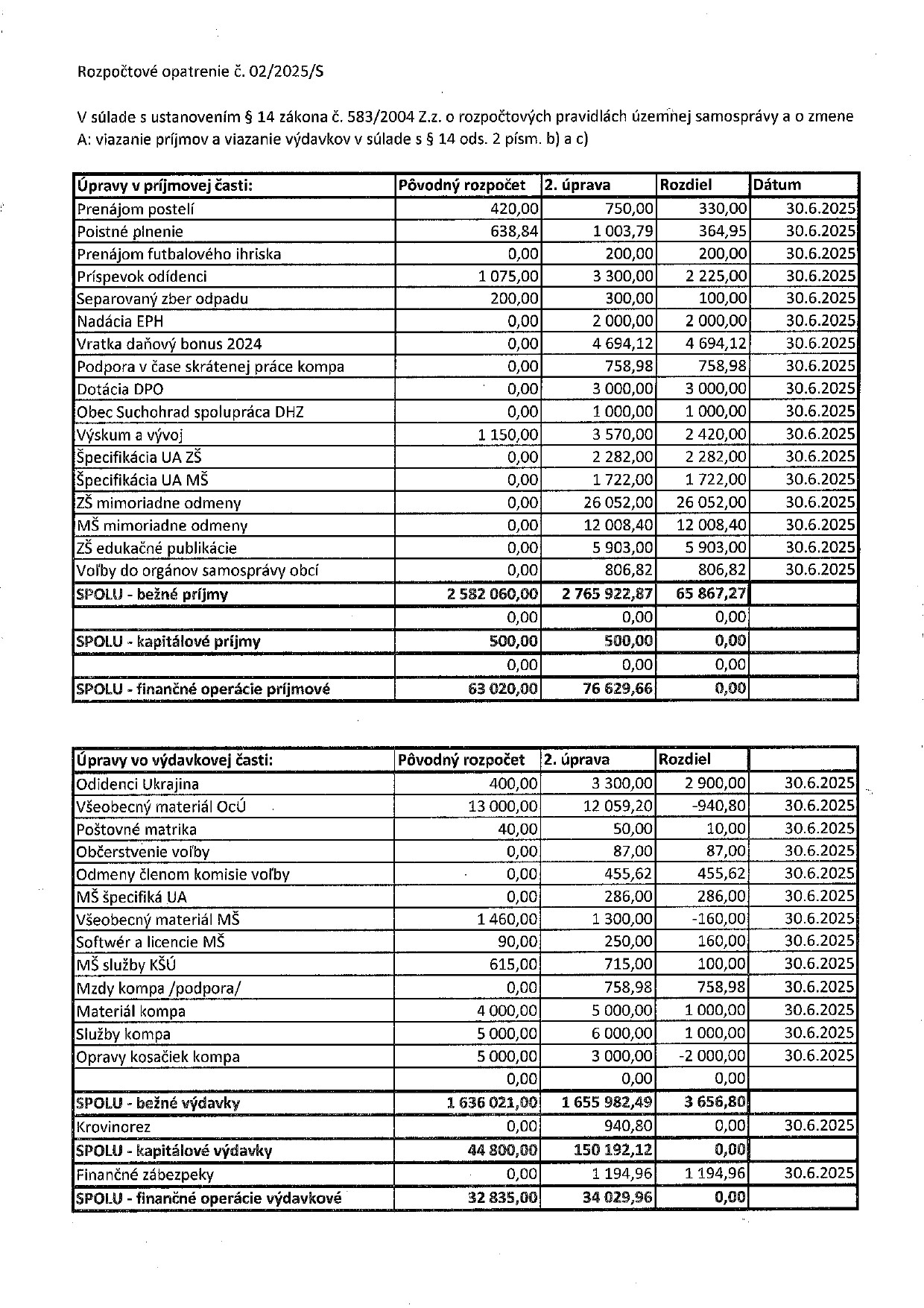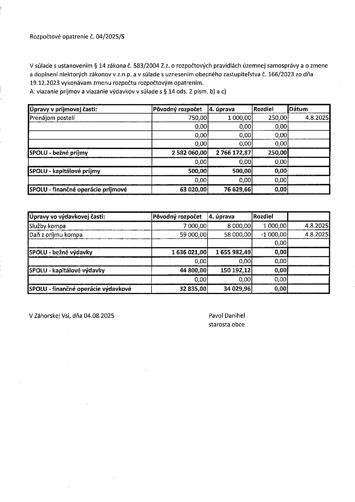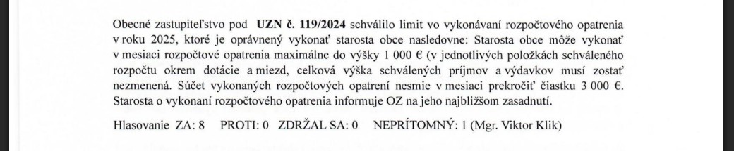 K rozpočtovým opatreniam starostu každoročne (pri schvaľovaní rozpočtu na ďalší rok) poslanci prijímajú to isté uznesenie. Mení sa len letopočet a číslo uznesenia. Na rozpočtové opatrenia starostu obce, urobené v roku 2025, sa vzťahuje uznesenie č. 119/2024.