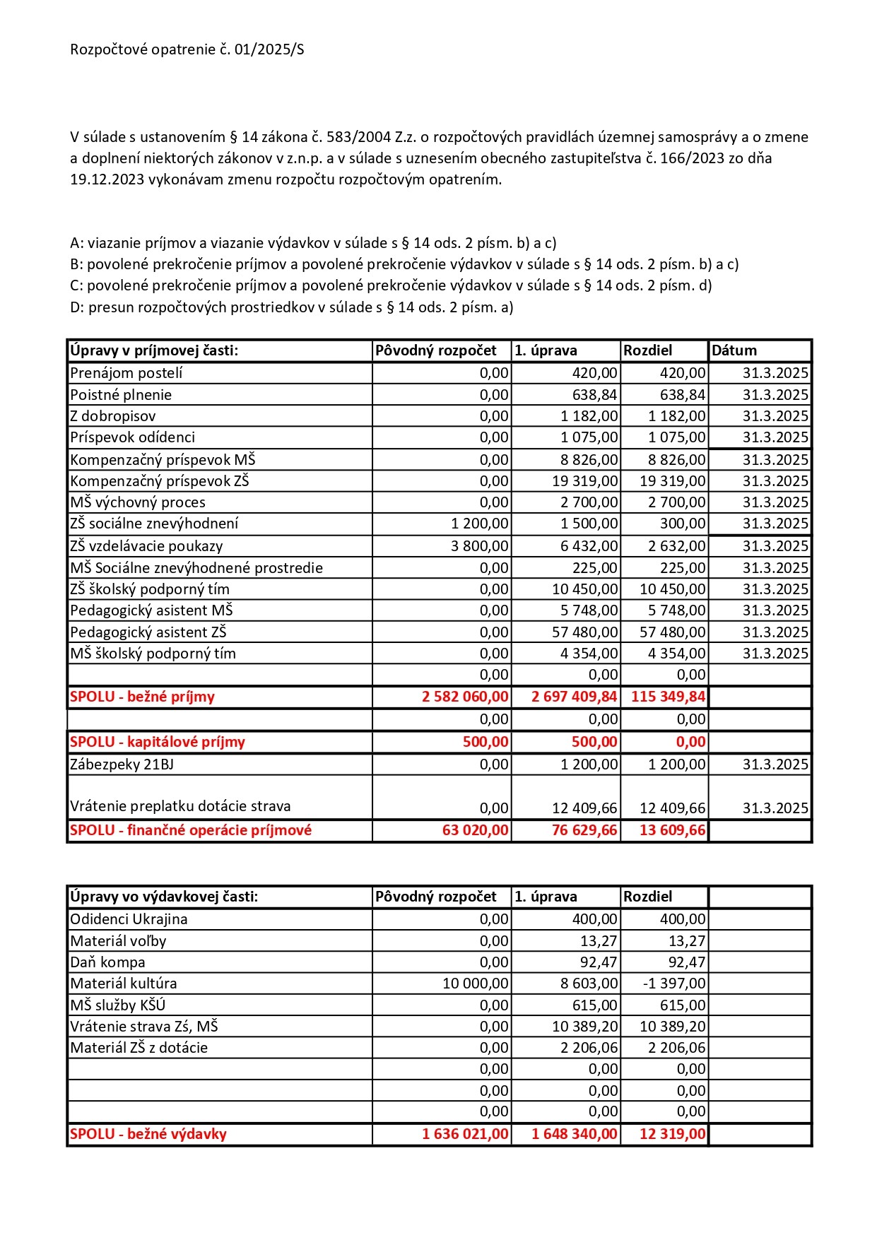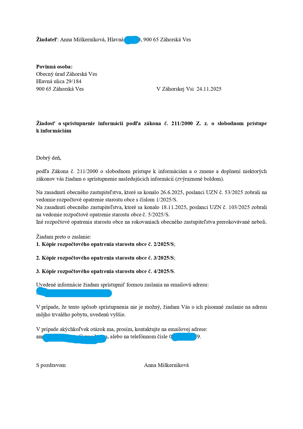 Na zasadnutí OZ, ktoré sa konalo 18.11.2025, poslanci vzali na vedomie rozpočtové opatrenie starostu č. 5/2025/S. Neskôr som si to skontrolovala, či si dobre pamätám - a áno, poslanci dovtedy brali na vedomie len RO 1/2025/S. Tak som si poslala ďalšiu infožiadosť.