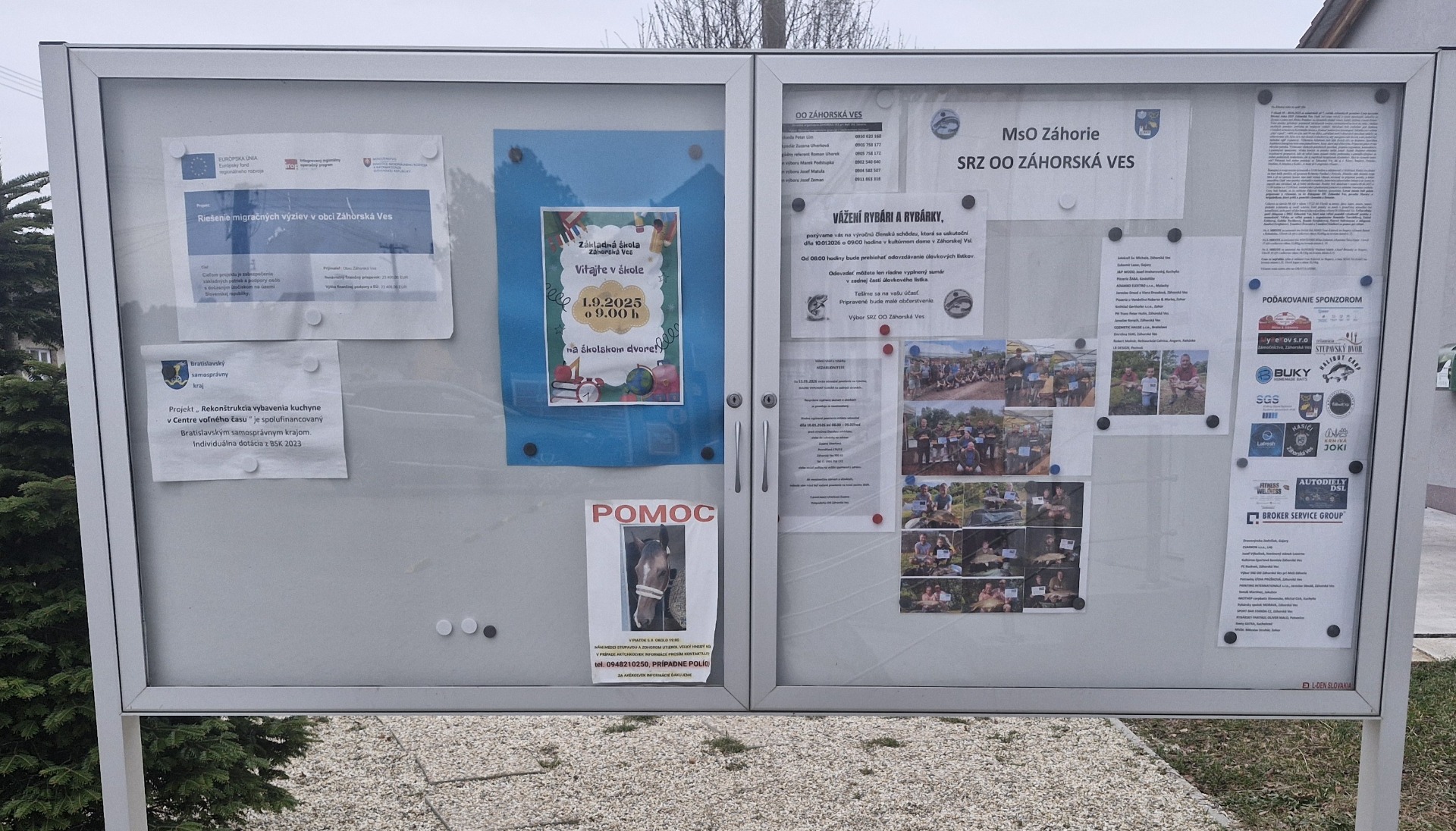 PS (pre "cezpoľných" čitateľov): Na náhľadovej fotke k článku je informačná tabuľa obecných spolkov, ktorá je umiestnená vedľa historickej budovy obecného úradu. Zmienila som sa o nej v článku o návrhoch do rozpočtu. Odvtedy rybári svoju časť tabule aktualizovali, informácie o prvom školskom dni 1.9.2025 a o hľadaní koňa z 5.9.2025 tam stále sú. Fotky som urobila 5.1.2026.