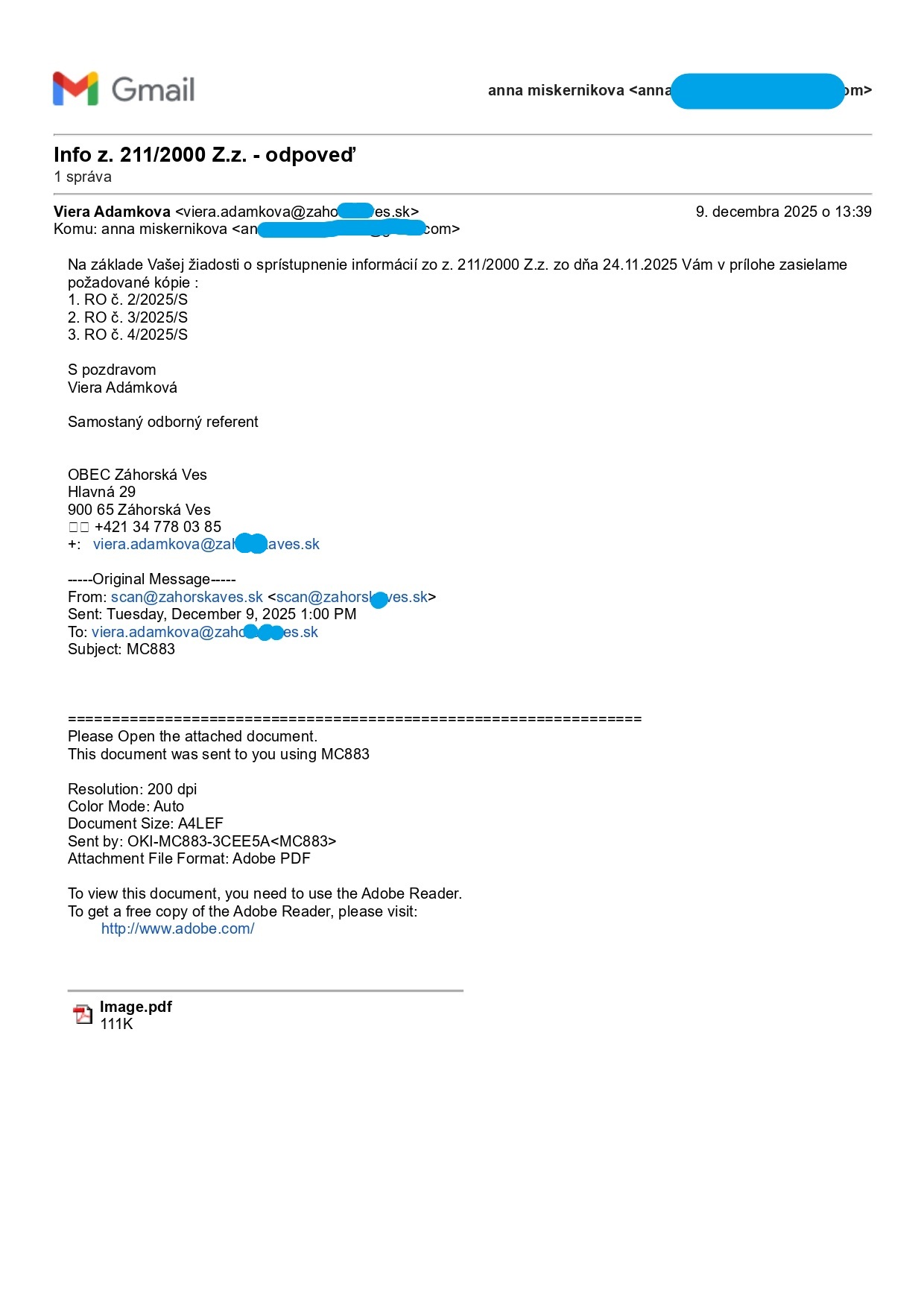 Odpoveď mi prišla na jedenásty pracovný deň.