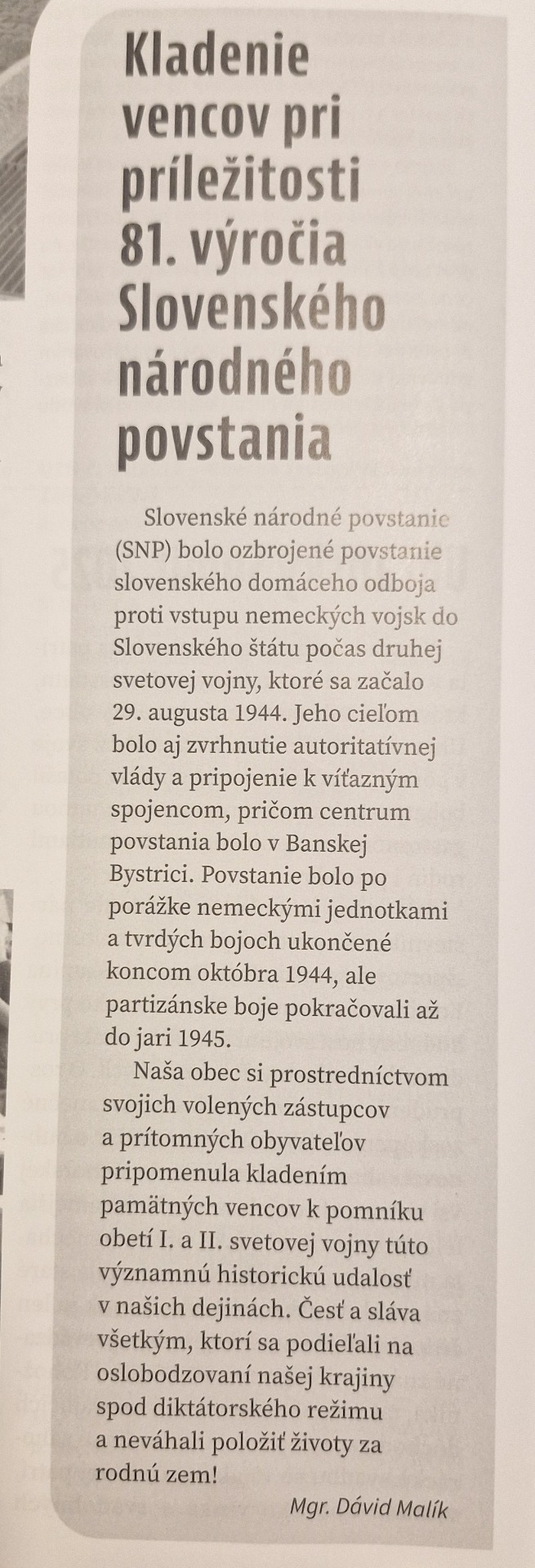 V diskusii na prvom septembrovom zasadnutí OZ sa totiž pani Ozábalová pýtala, či bolo kladenie vencov k 81. výročiu SNP, lebo nikde nebol o tom žiadny oznam. Starosta obce odpovedal, že to je jeho chyba, a že pri pomníku bol deň pred výročím spolu s pani Zvěřinovou a pani Adámkovou. Výročie totiž pripadlo na piatok a on odchádzal s rodinou na predĺžený víkend.