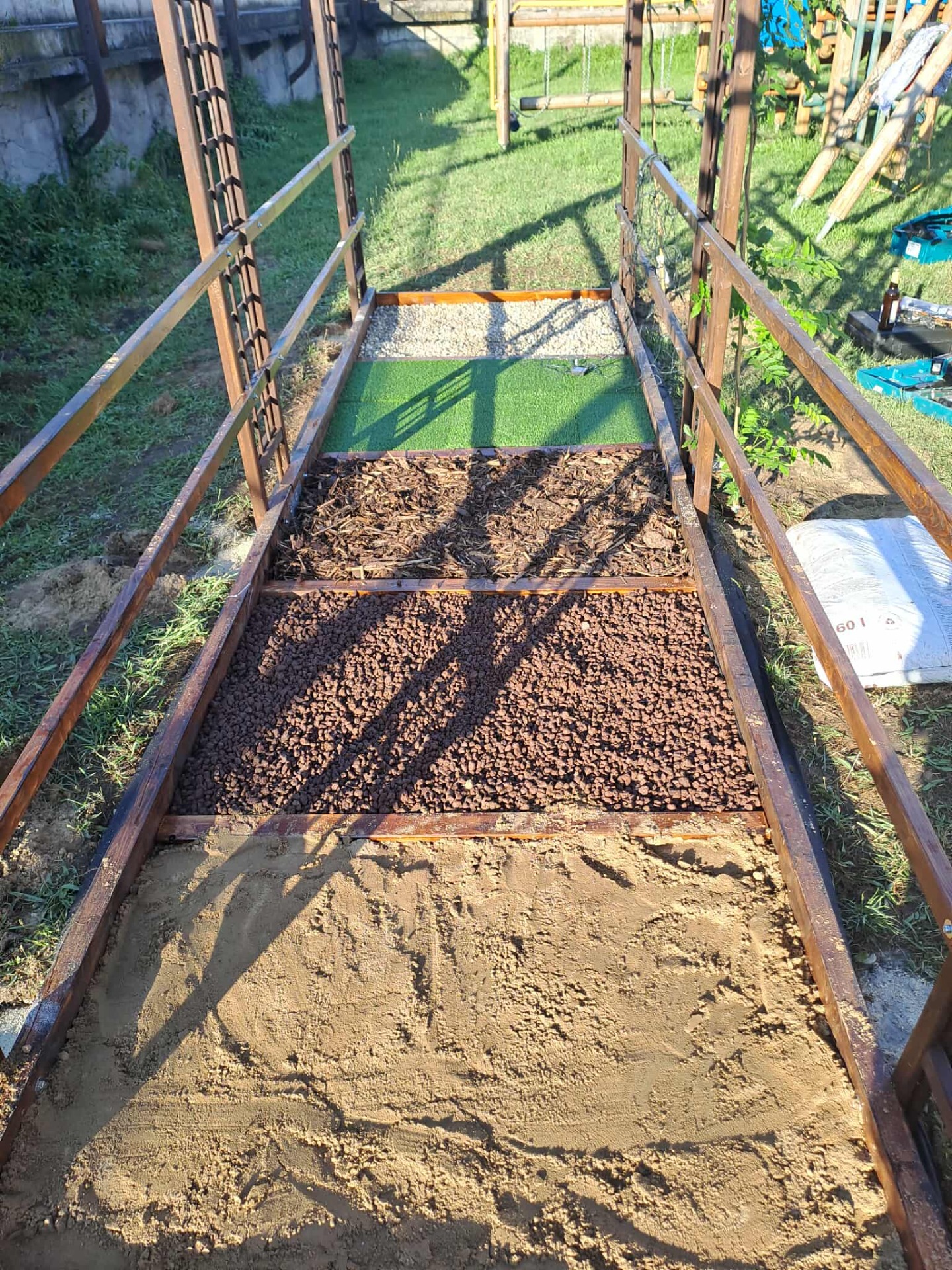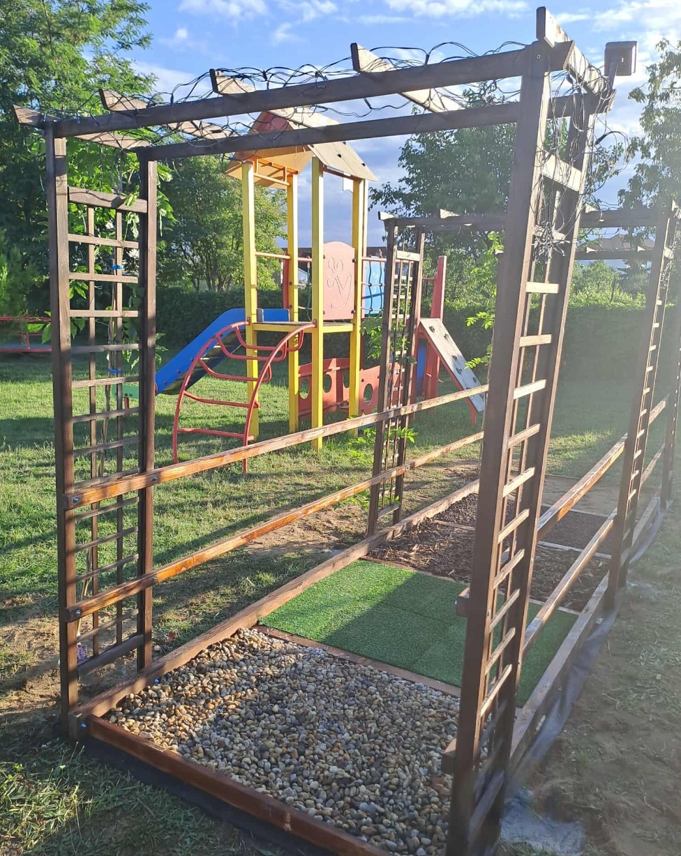 Nový senzorický chodník na detskom ihrisku bol naplánovaný a skonštruovaný tak, aby bol dostatočne priestranný aj pre dospelákov, má zábradlie v dvoch rôznych výškach, aby bolo dostatočné pre menšie i väčšie deti. Je doplnený tromi pergolami, na ktorých sú vysadené vistérie vo farbách ružová a fialová a do troch rokov by preto mal byť plne zatienený. Závlaha rastlín je riešená hlinenými nádobami, čo uľahčuje starostlivosť o rastliny. Na pergolách sú umiestnené solárne svetelné siete, ktoré svietia až v tme, keď je ihrisko uzatvorené, ale prispievajú k estetickosti a bezpečnosti. Vyskúšajte tento prvok, ak ste skeptickí k zdravotným benefitom, tak iba tak – pre zábavu. Zoberte so sebou pokojne aj babku a dedka, tento prvok je naozaj určený všetkým vekovým kategóriám