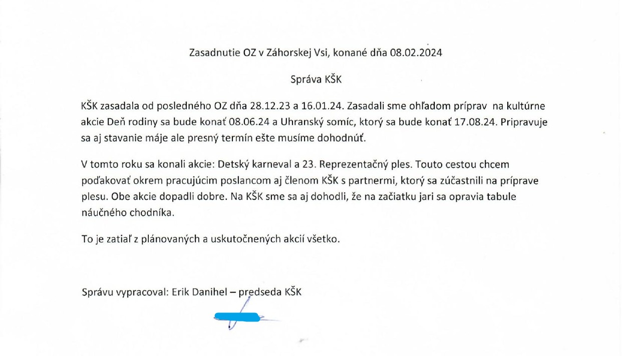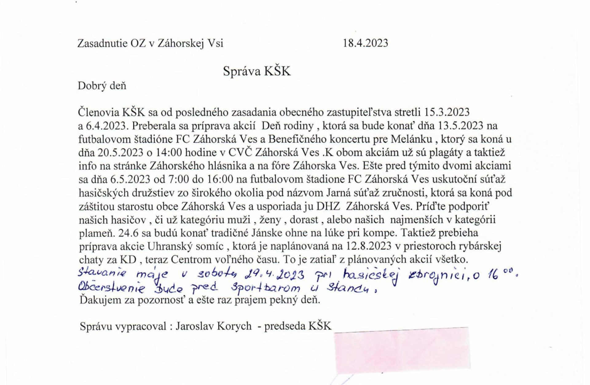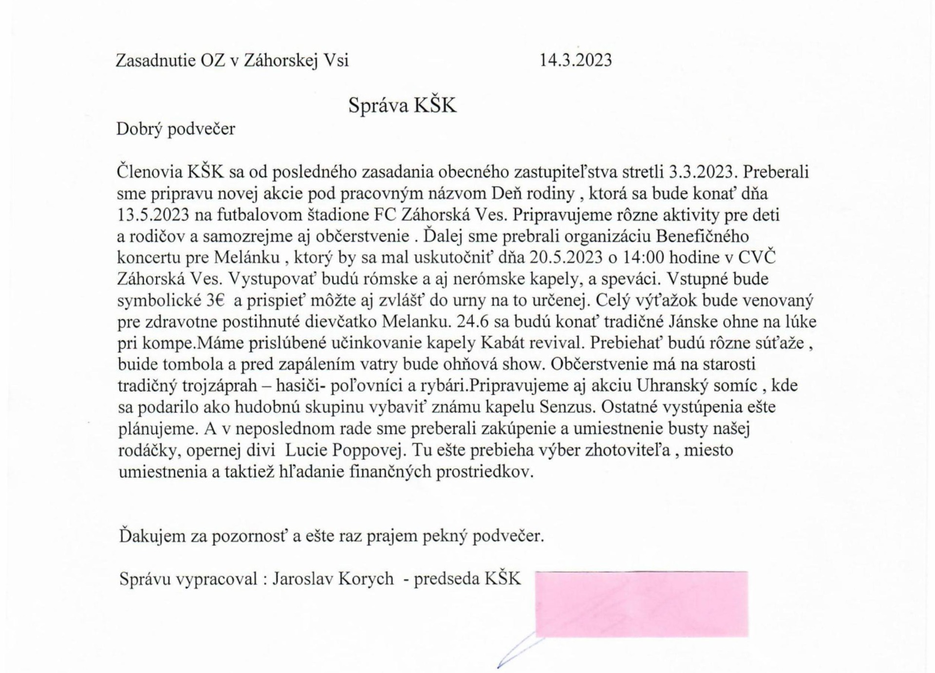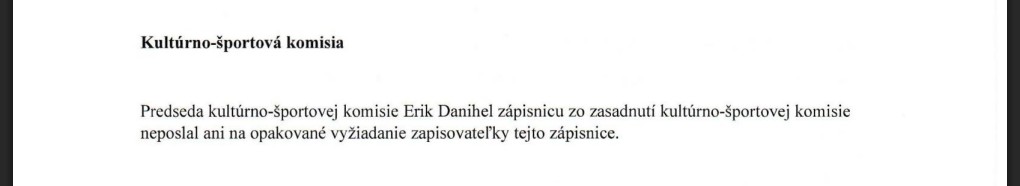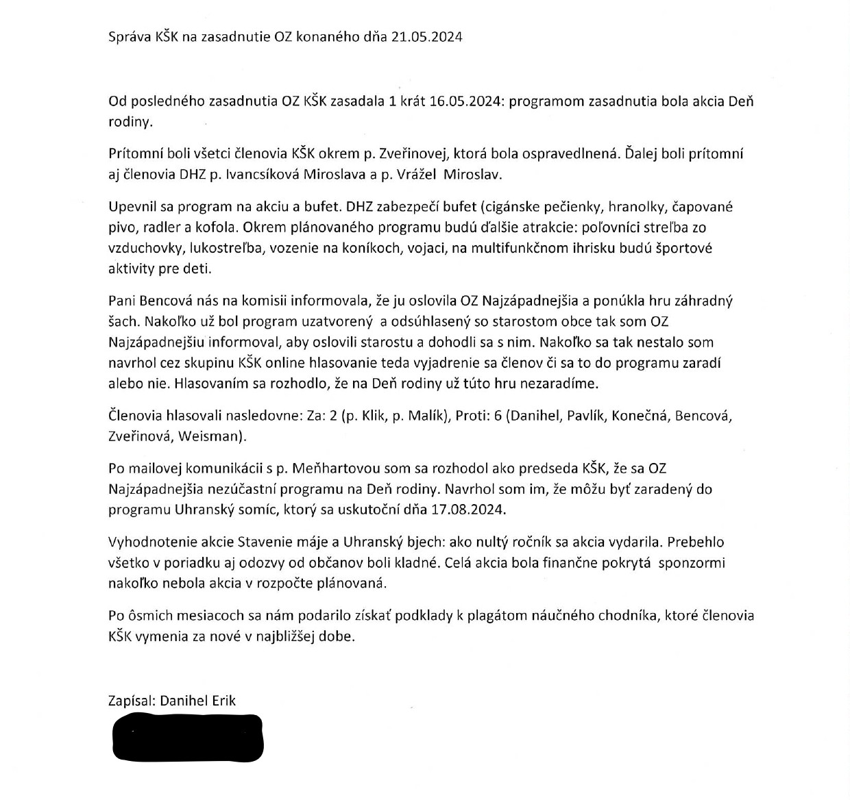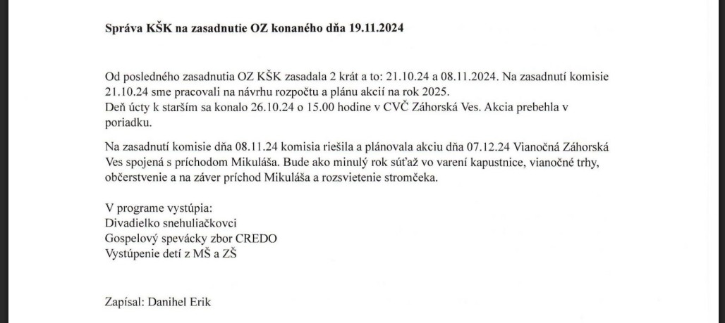 Prílohy k zápisnici nie sú priložené, tak pridávam videozáznam zo zasadnutia - od 12:15 Erik Danihel hovorí, že KŠK od posledného zasadnutia zastupiteľstva nezasadala a poďakoval hasičom za pomoc pri Dni rodiny.
