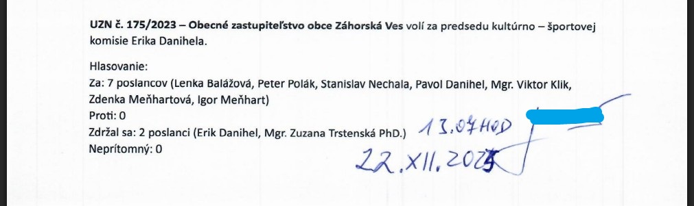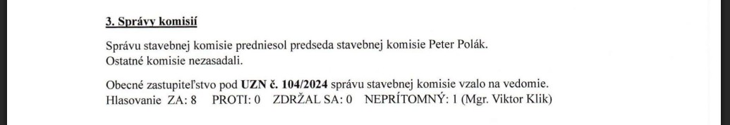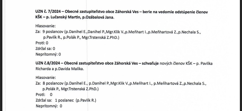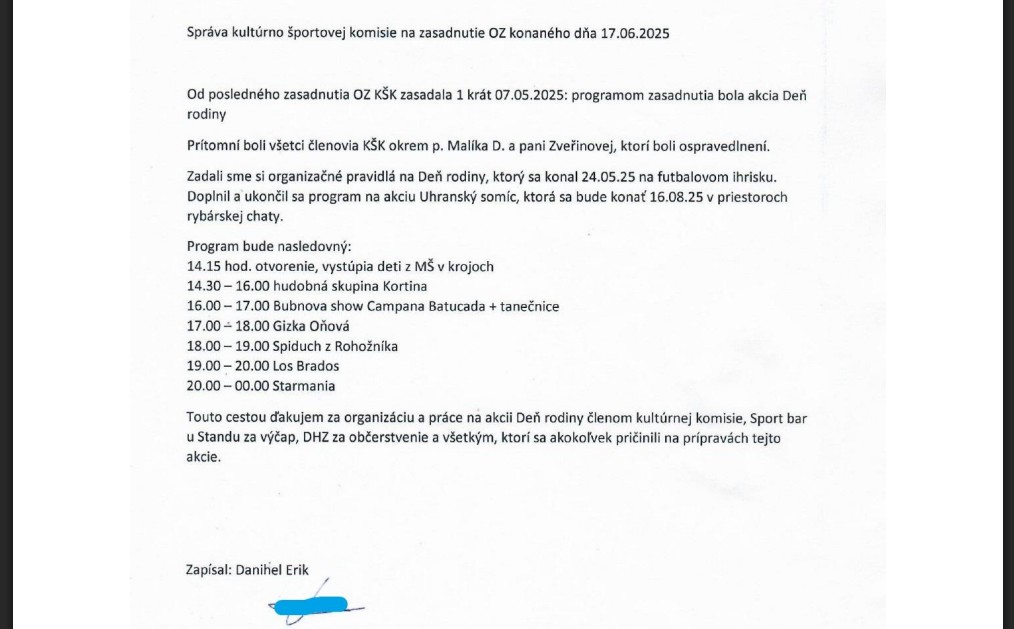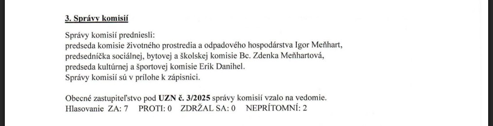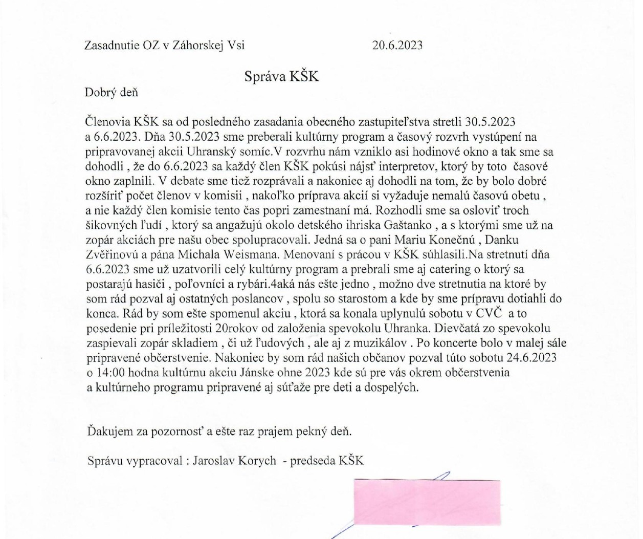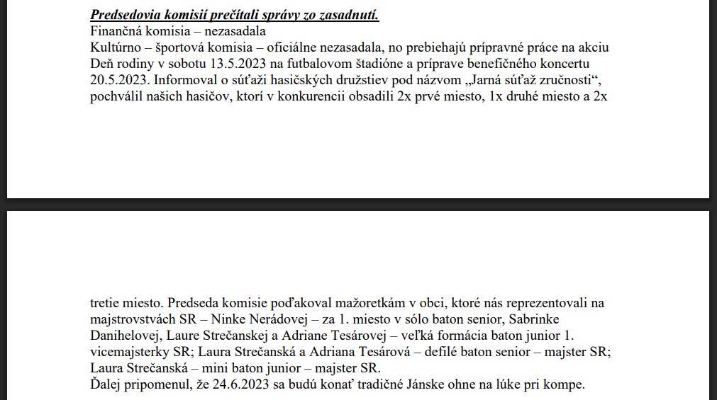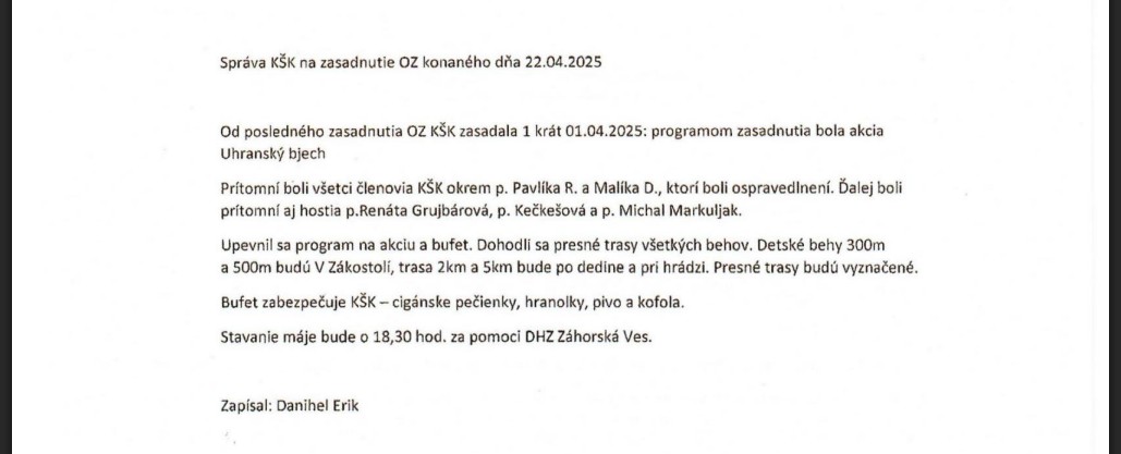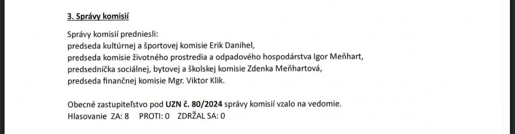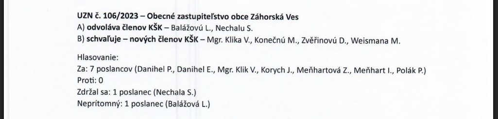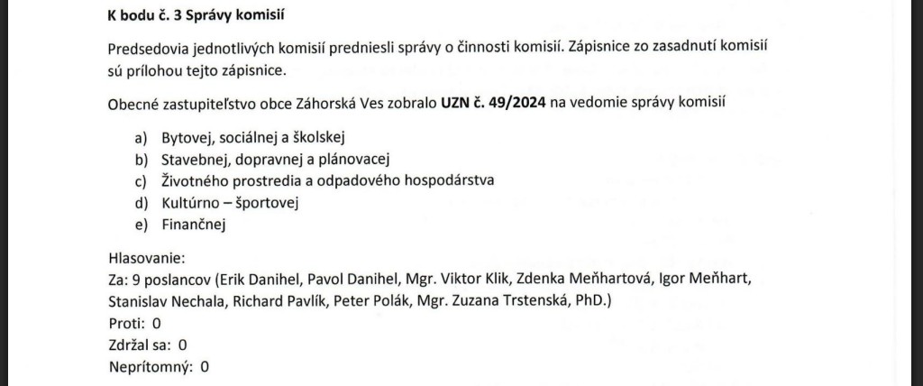 Prílohy k zápisnici nie sú priložené, tak pridávam videozáznam zo zasadnutia - od 12:15 Erik Danihel hovorí, že KŠK od posledného zasadnutia zastupiteľstva nezasadala a poďakoval hasičom za pomoc pri Dni rodiny.