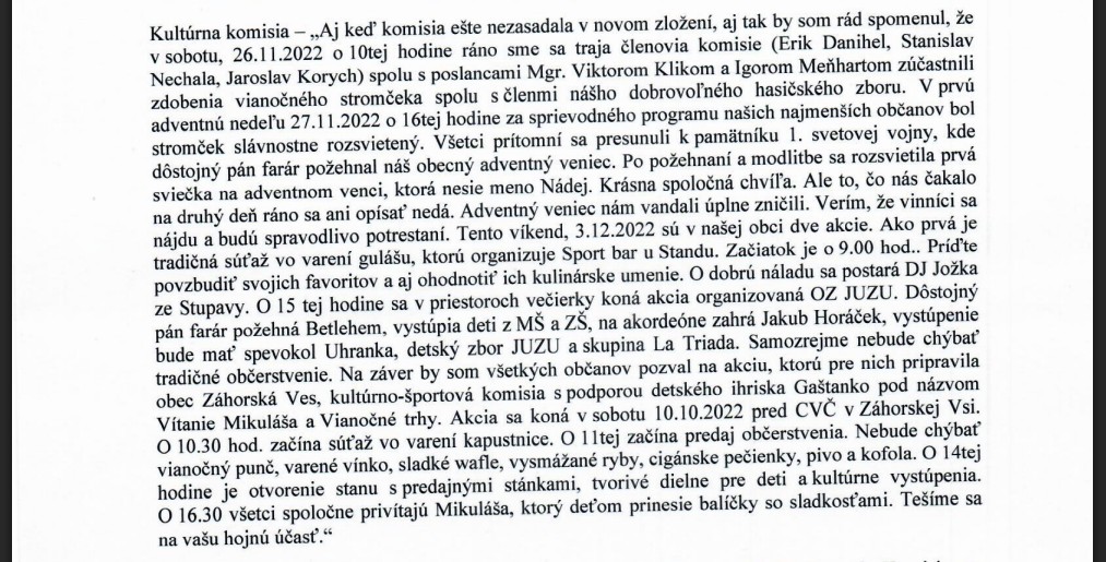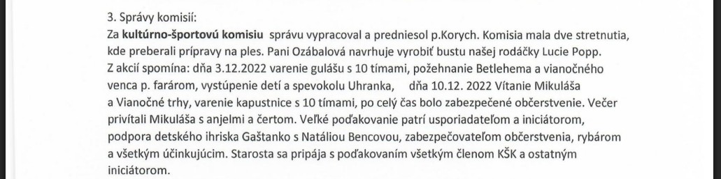 V zápisnici viac informácií nie je, takže zase záznam. Od 2:50 Erik Danihel informuje, že komisia zasadala trikrát. Na prvom zasadnutí doriešovali Deň rodiny, na druhom Deň úcty k starším a na treťom Vianočnú Záhorskú Ves.