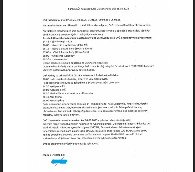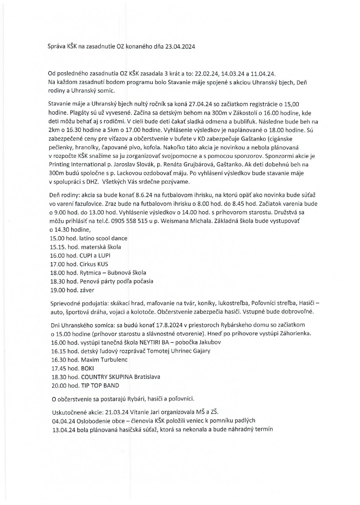 Ak ste si prečítali správy zo zasadnutí komisie, možno ste si všimli, že za toto volebné obdobie pribudla v obci len jedna akcia, ktorú organizuje obec. Tou je Uhranský bjech, čiže športová akcia. Jasne, aj to treba, bez debaty.