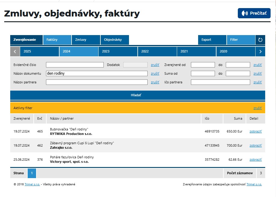 Čiže v roku 2023 obec platila (čiastkové) náklady na túto akciu vo výške 2 444,00 €, v roku 2024 zaplatila 2 994,00 € a v roku 2025 zaplatila 2 972,00 €.