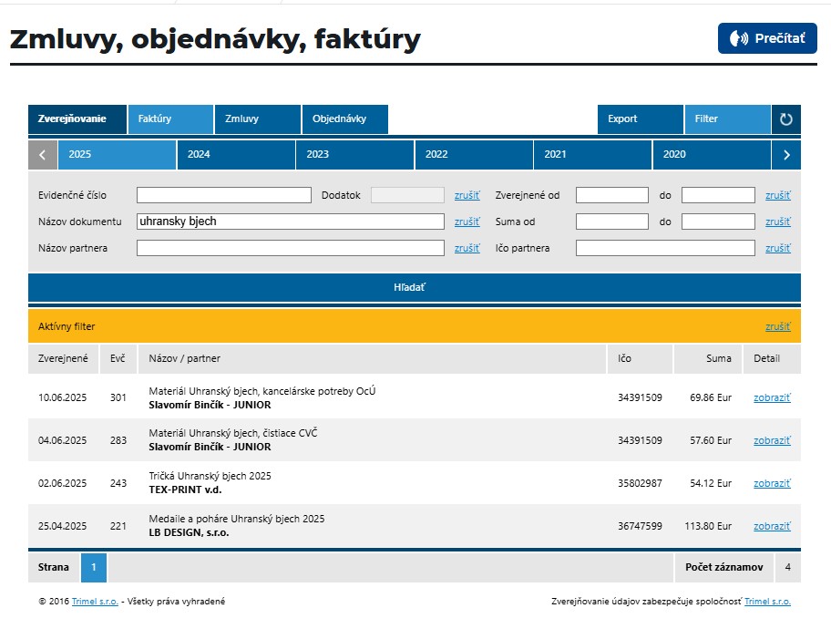 Čiže v roku 2023 obec platila náklady na túto akciu vo výške 1 356,25 €, v roku 2024 zaplatila 1 412,66 € a v roku 2025 zaplatila 4 858,21 €.
