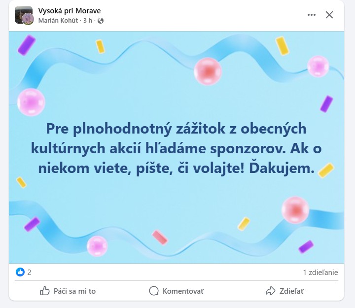 Aha, čo bolo dnes zverejnené na FB Vysoká pri Morave.