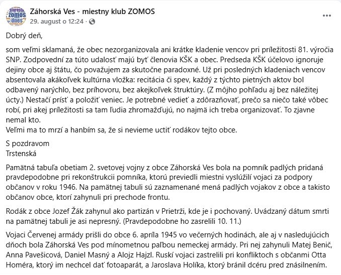 29.8.2025 12,24 hod. FB Záhorská Ves - miestny klub ZOMOS