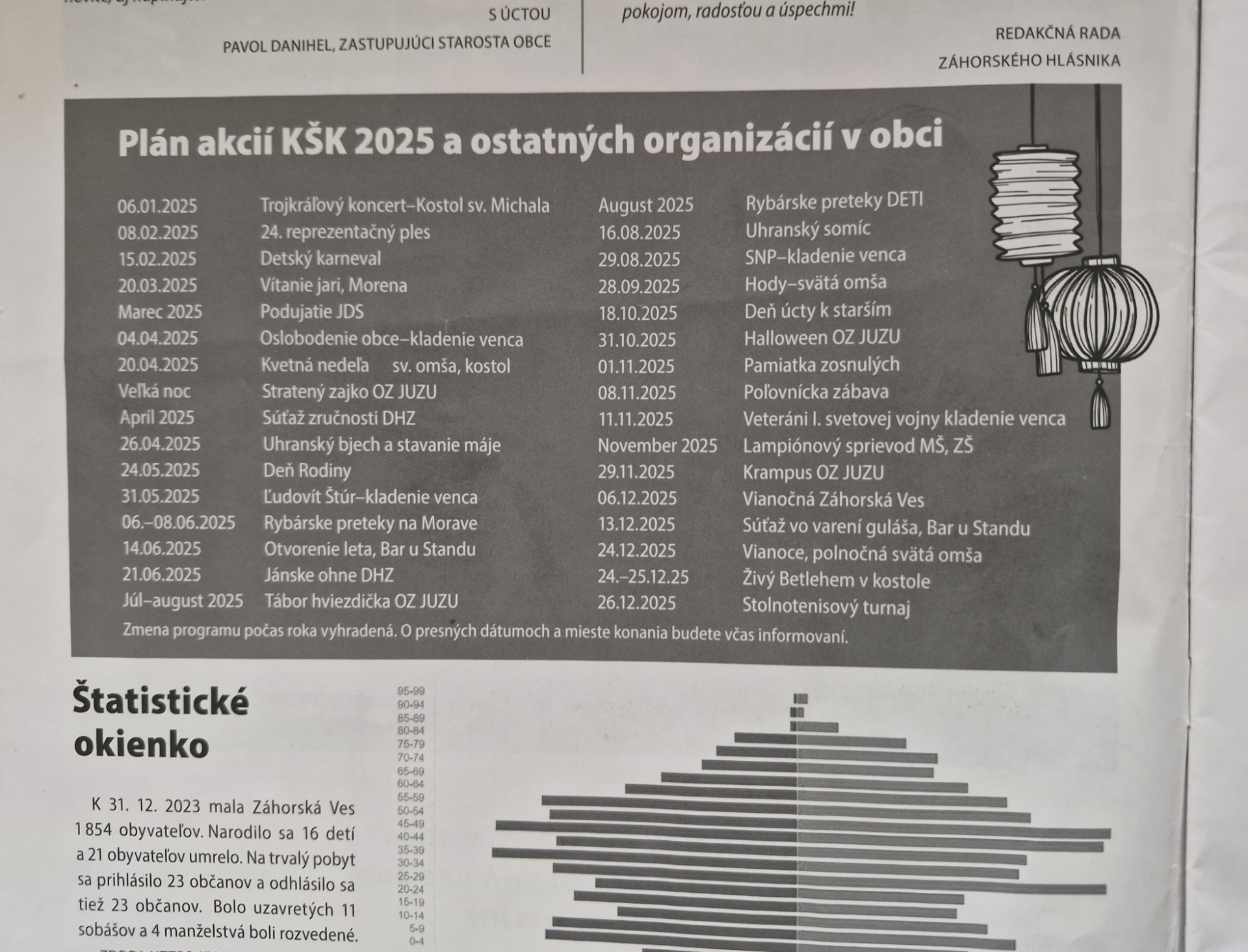 Kalendár akcií v obci, sme (čítaj - bývalá redakčná rada) od predsedu KŠK pýtali opakovane. Nakoniec sme ho dostali v termíne, kedy ešte bolo možné zaradiť ho do vianočného čísla Záhorského hlásnika. Síce len tak-tak, ale zvládli sme to.