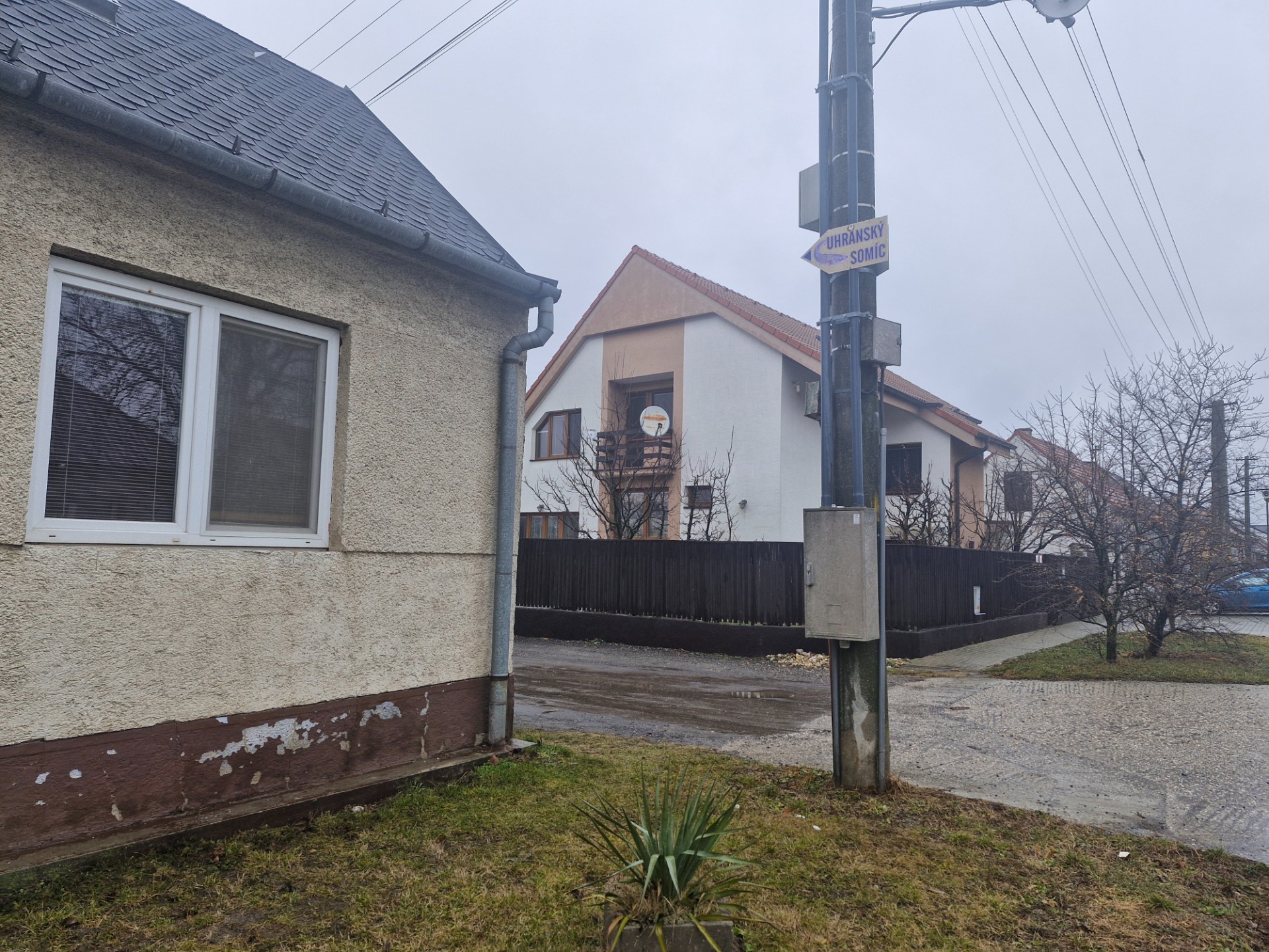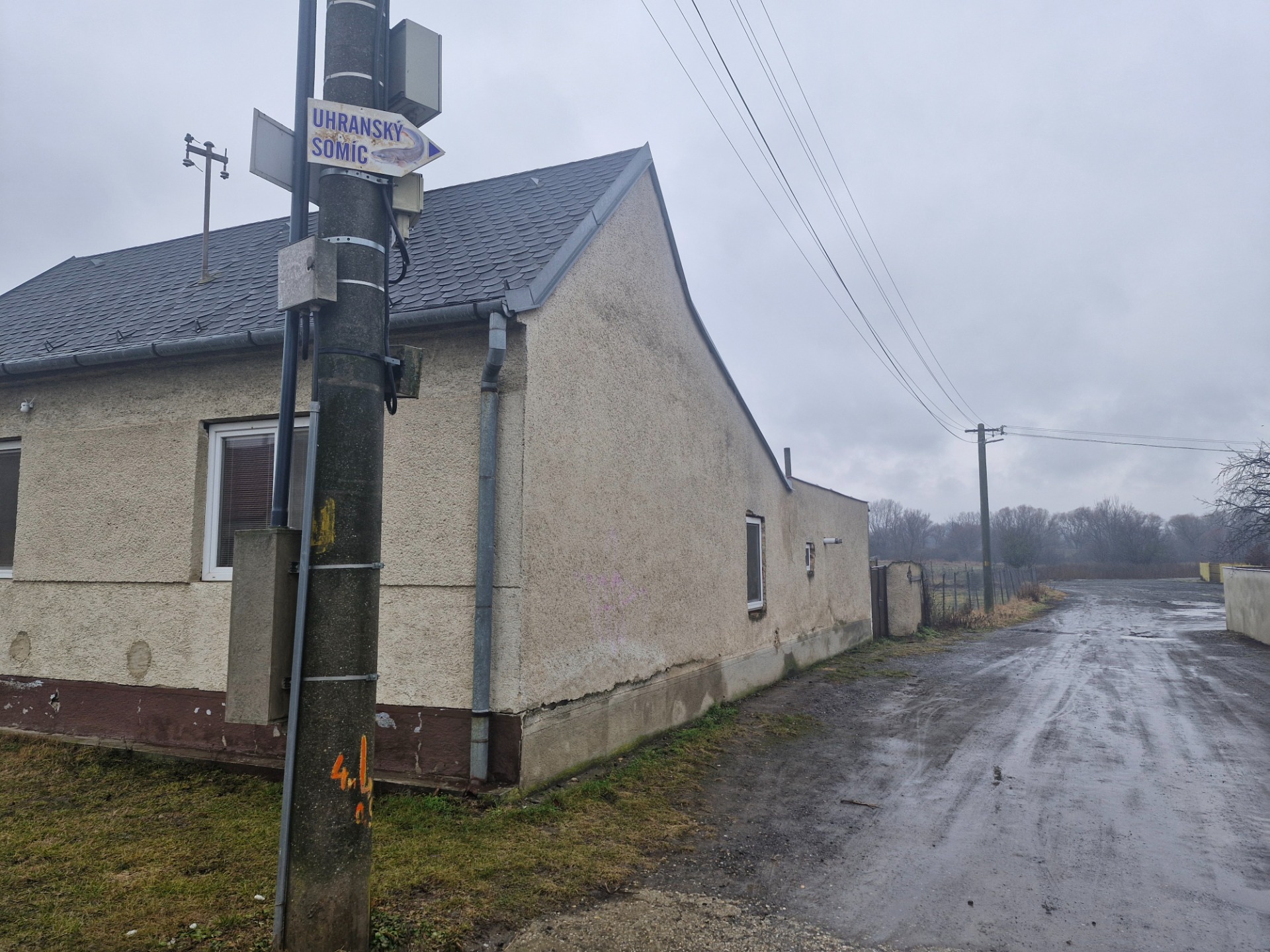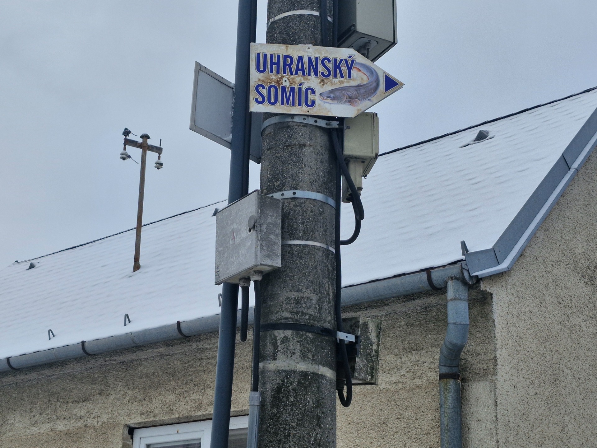 "cezpoľných" čitateľov – na náhľadovej fotografii je záber na stĺp elektrického vedenia na hlavnej ulici pri vjazde na štadión, kde sa v auguste konala akcia s názvom Uhranský somíc. Fotografiu som urobila 23.11.2025, keď som chcela zachytiť absurditu smerovej tabule, navigujúcej na jednodennú letnú akciu, v kombinácii so zasneženou strechou domu v pozadí.