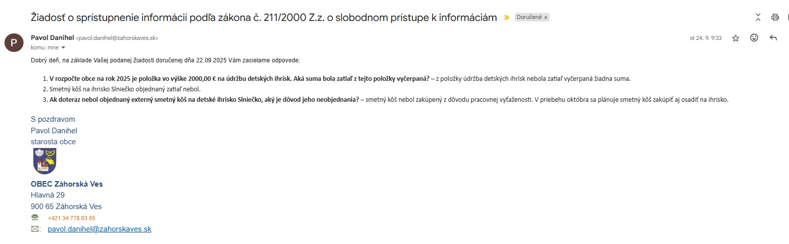 Každý piatkový večer chodím do knižnice, tak sa vždy pozriem, čo je nové na detskom ihrisku, ktoré je hneď oproti. Keď kontajner na domový odpad nebol vymenený ani po ďalších troch mesiacoch, poslala som 22.9.2025 na obecný úrad žiadosť o poskytnutie informácií podľa zákona č. 211/2000 (Infozákon). Obecnému úradu som v žiadosti položila tri otázky: