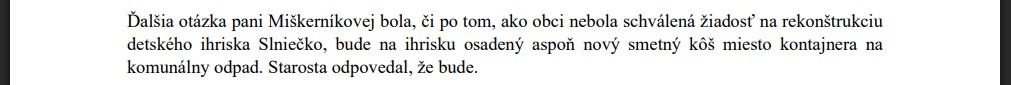 2. Na zasadnutí obecného zastupiteľstva, ktoré sa konalo 10.6.2025, starosta obce uviedol, že na detské ihrisko Slniečko miesto kontajnera na komunálny odpad, ktorý je tam teraz, bude zakúpený externý smetný kôš na separovaný odpad. Odvtedy uplynuli viac ako tri mesiace, bol už tento externý smetný kôš objednaný?