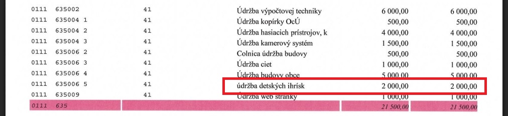 - V rozpočte obce na rok 2025 je položka vo výške 2000,00 € na údržbu detských ihrísk. Aká suma bola zatiaľ z tejto položky vyčerpaná? – z položky údržba detských ihrísk nebola zatiaľ vyčerpaná žiadna suma.