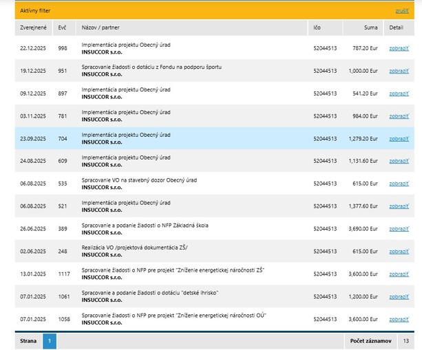 rásť, faktúry za implementáciu projektu INSUCCOR priebežne na úrad posiela