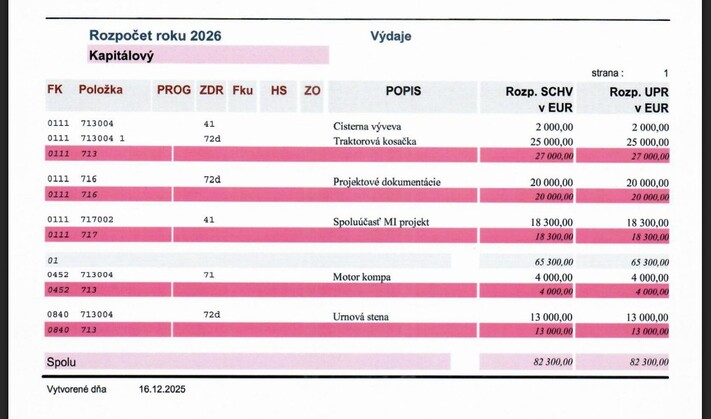 Na novú urnovú stenu je v rozpočte obce na rok 2026 určených 13 000