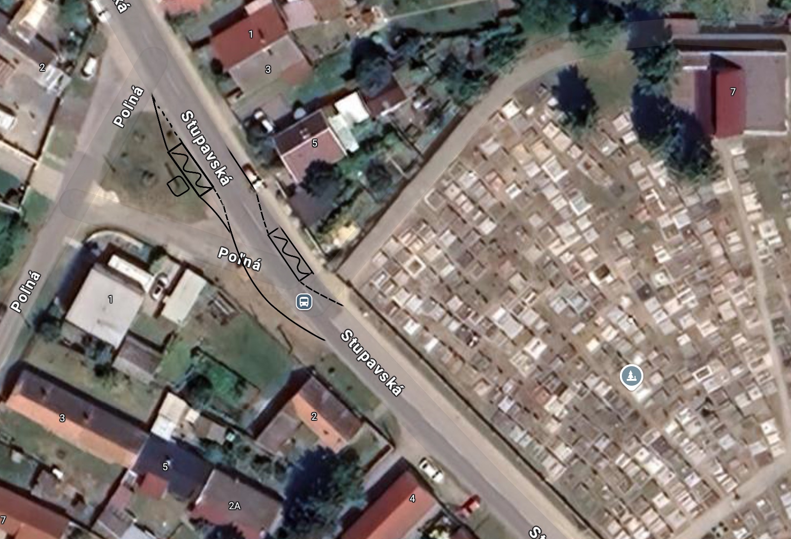 priestoru a historických rozhodnutí: chýba riadne obratisko pre autobusy, je tu len polozáliv (aspoň niečo), prístrešok (ale zanedbaný), lavička (na hrane použiteľnosti), autobus blokuje výhľad z vedľajšej cesty. Miešajú sa tu teda funkcie, ktoré sa nemajú diať na jednom mieste.