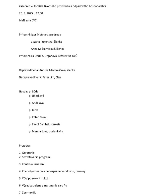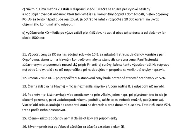 (Upozorňujem obzvlášť bod 10. a) ; pod správu pridávam obrázok z Oznamov starostu pred súčasným sídlom OcÚ, kde je tam uvedené, že od Envirofondu sme na zberný dvor dostali finančný príspevok vo výške 386 042,25 € - pozn. AM)
