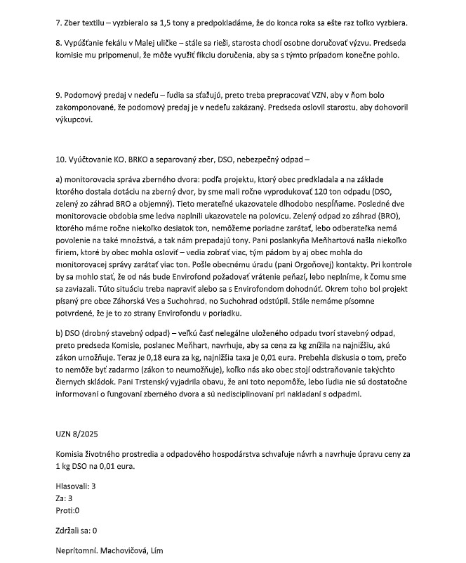 * obec zatiaľ vymohla len 1 500 € nedoplatkov za komunálny odpad (k 31.12.2024 bola výška nedoplatkov vo výške 75 497,25 €)